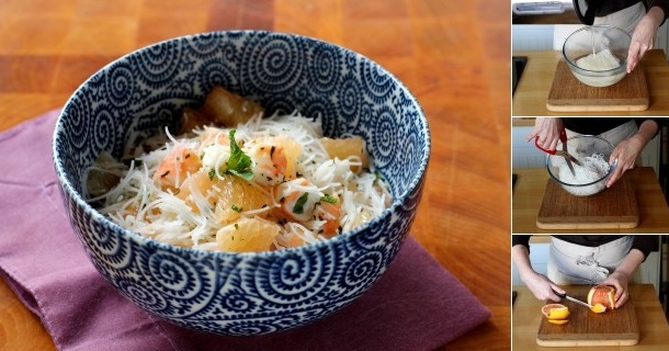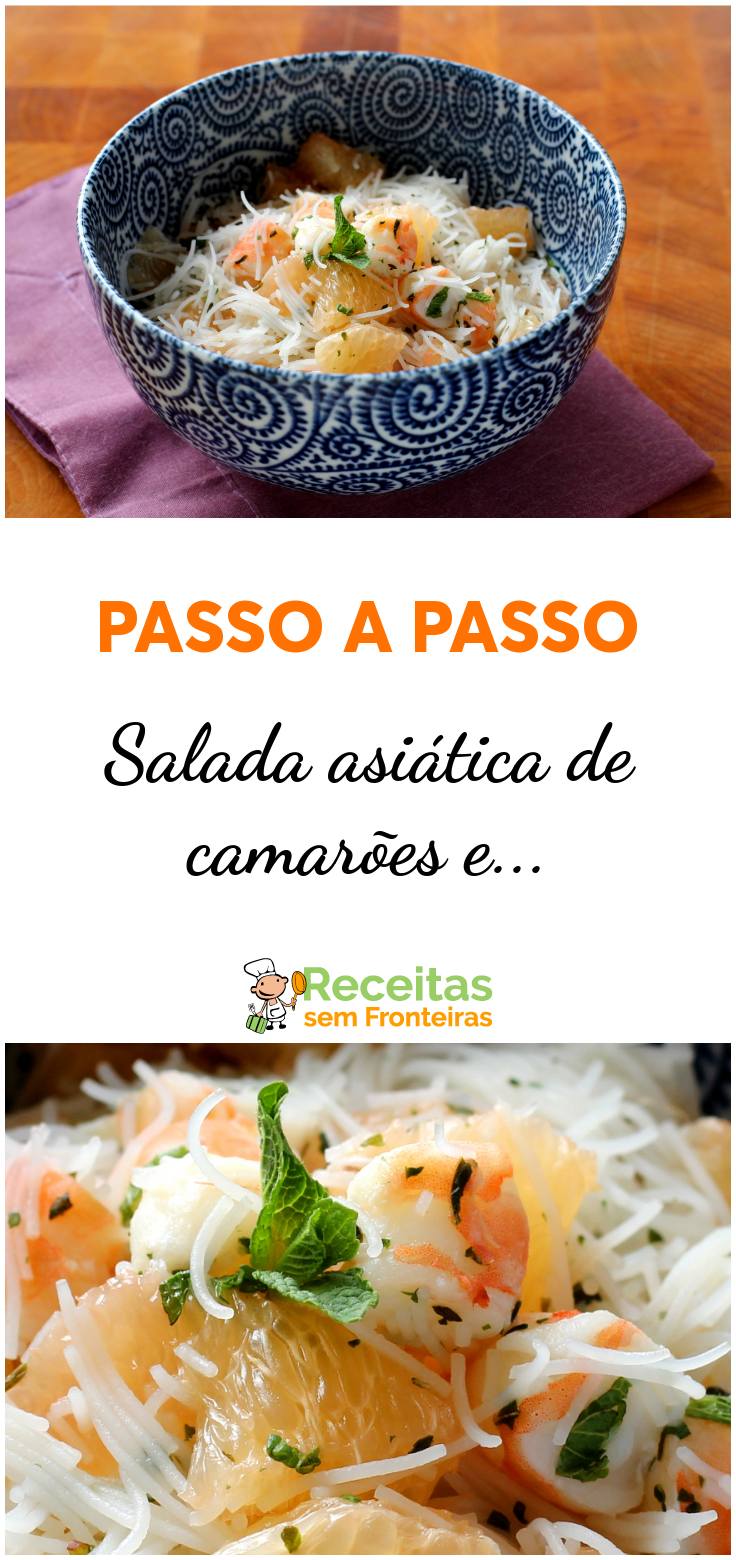 Como fazer uma salada super leve com grapefruit, camarões e macarrão de arroz. Receita passo a passo.