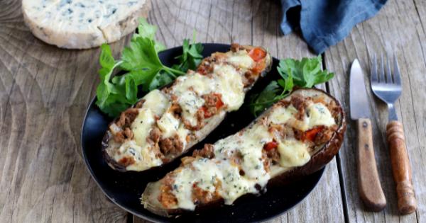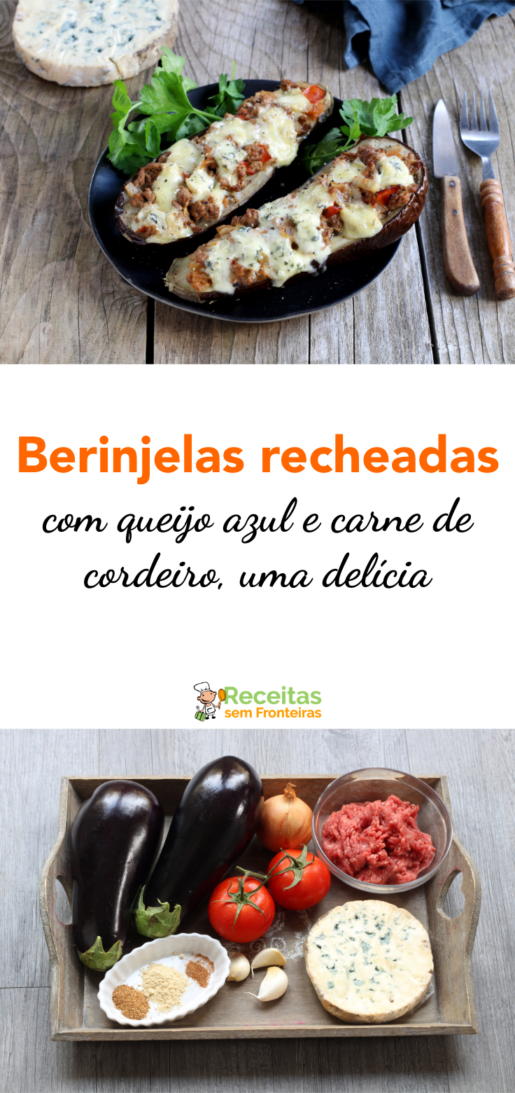 Deliciosa berinjela assada recheada com carne de cordeiro e queijo azul