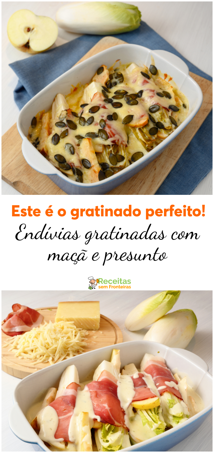 Um ótimo gratinado: maçãs, endívias, presunto e queijo. As sementes de abóbora torradas são a cereja do bolo deste sonho assado e é assim que é feito: