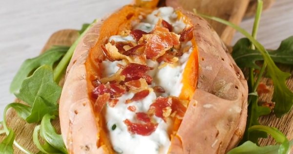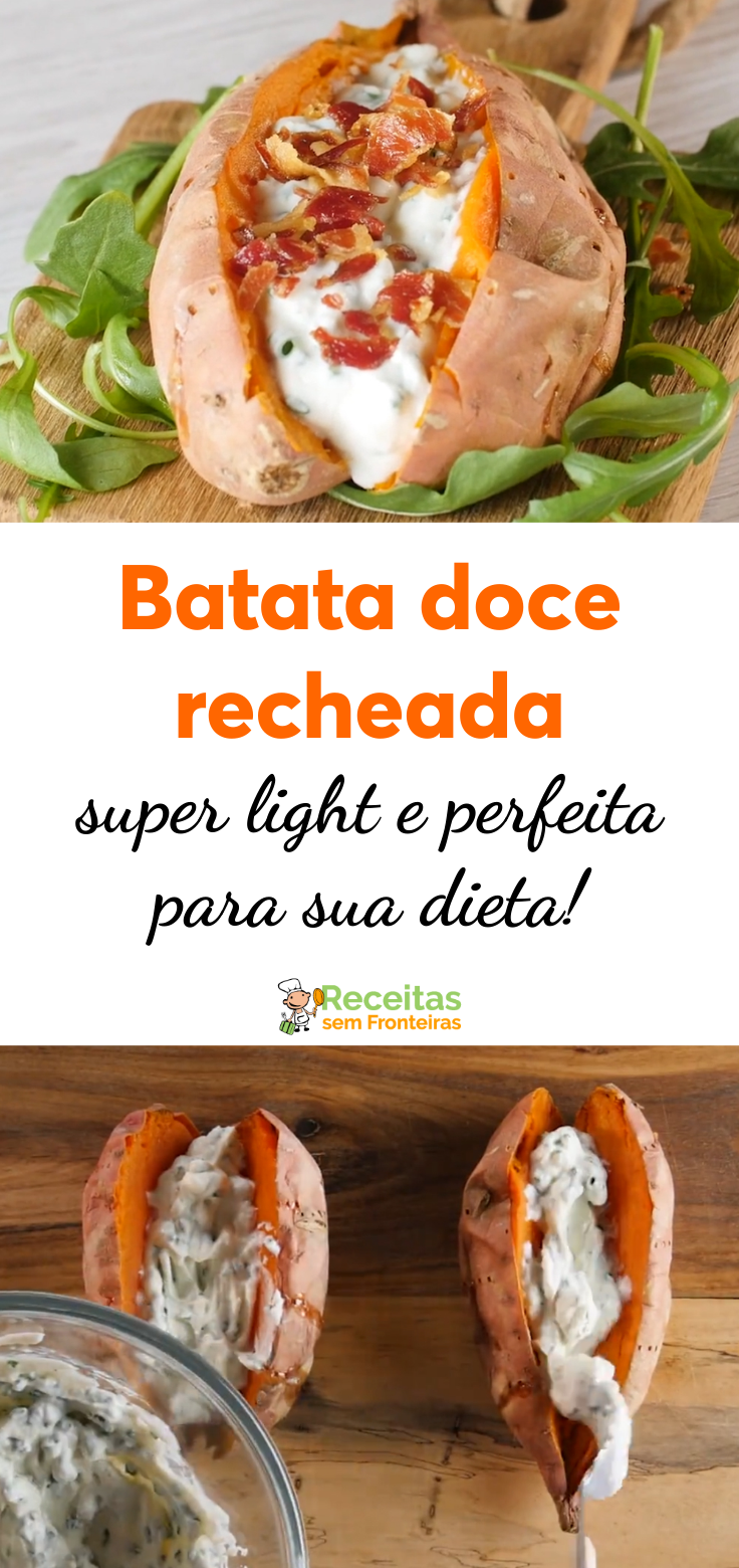 Receita fácil: batata doce assada com queijo, cebolinha e bacon!