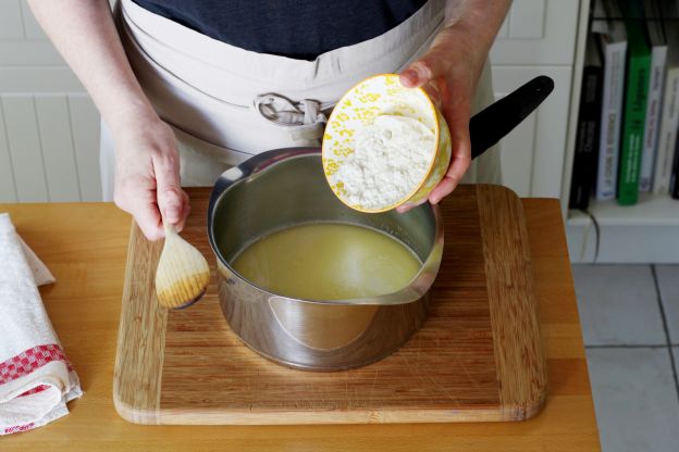 Então podemos começar a fazer a massa choux: aqueça a água em uma panela, adicione o leite, o sal, o açúcar e a manteiga em pedaços. Por fim, coloque a farinha na panela