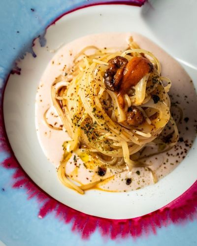 Na foto pode admirar o Spaghetti con salsa di noci Lara (esparguete com molho de nozes Lara), chocos crus e ouriços-do-mar. Um prato com um sabor forte e reconfortante.