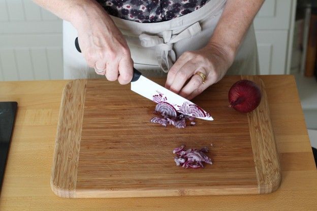 Retire a pele da cebola e pique-a finamente. Reserve duas colheres (de sopa).