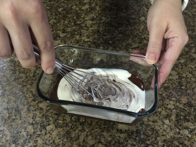 Veja se o chocolate já amoleceu apoiando ligeiramente sobre ele, se não tiver resistência está no ponto. Misture de início lentamente, a partir do centro, e depois com mais vigor atingindo também as laterais até que todo ele esteja derretido e liso. Deixe esfriar.