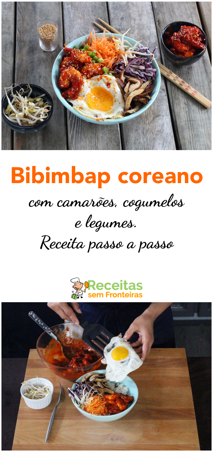 Bibimbap coreano com camarões, cogumelos e legumes. Receita passo a passo