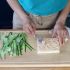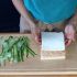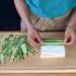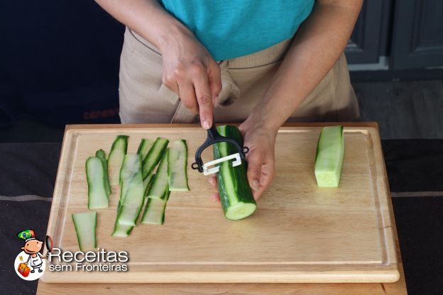 Lave, seque e descasque o pepino com o cortador especial de legumes e depois recorte as lâminas de casca em lâminas mais finas.