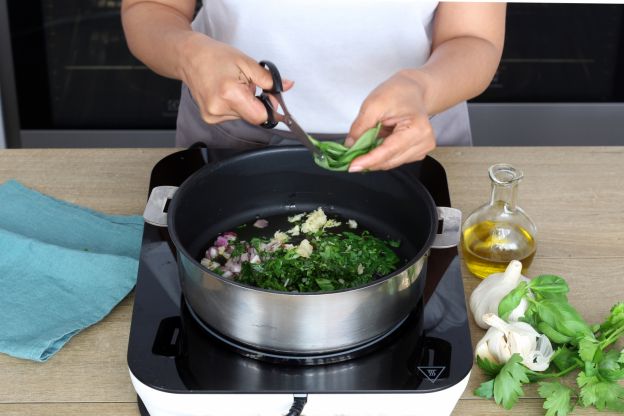 Lave bem os mexilhões e as amêijoas. Numa panela funda, aqueça o azeite e acrescente as cebolas, o alho, a salsa e o manjericão.