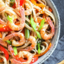 Macarrão oriental com camarões salteados