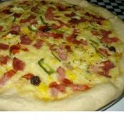 Coloque em um prato fundo o molho de tomate em seguida o presunto , os cogumelos, as azeitonas, a mussarela e por f...