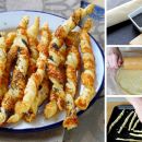 Basta pegar 3 batatas, cortá-las em 4 no sentido do comprimento, sem tirar as cascas e depois regar com bastante azeite, polvilhar 50 g de queijo parmesão ralado, sal, páprica (doce, picante ou as duas), ervas de Provence e alho em pó. Dispor as batatas sobre um papel manteiga em um tabuleiro e levar ao forno para assar por 10 minutos a 180°/200°C.