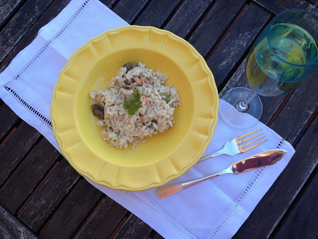 Risotto Colocar 1 colher de manteiga numa panela, deixar derreter, colocar a cebola e deixar refogar um pouco