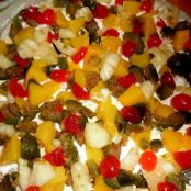 - Outros: Pedaços de abacaxi cozido para decorar Chantilly para cobrir o bolo.