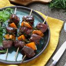 Cubos de cordeiro grelhado revestidos com pistache, gergelim, tomates secos, figos e damascos, nozes