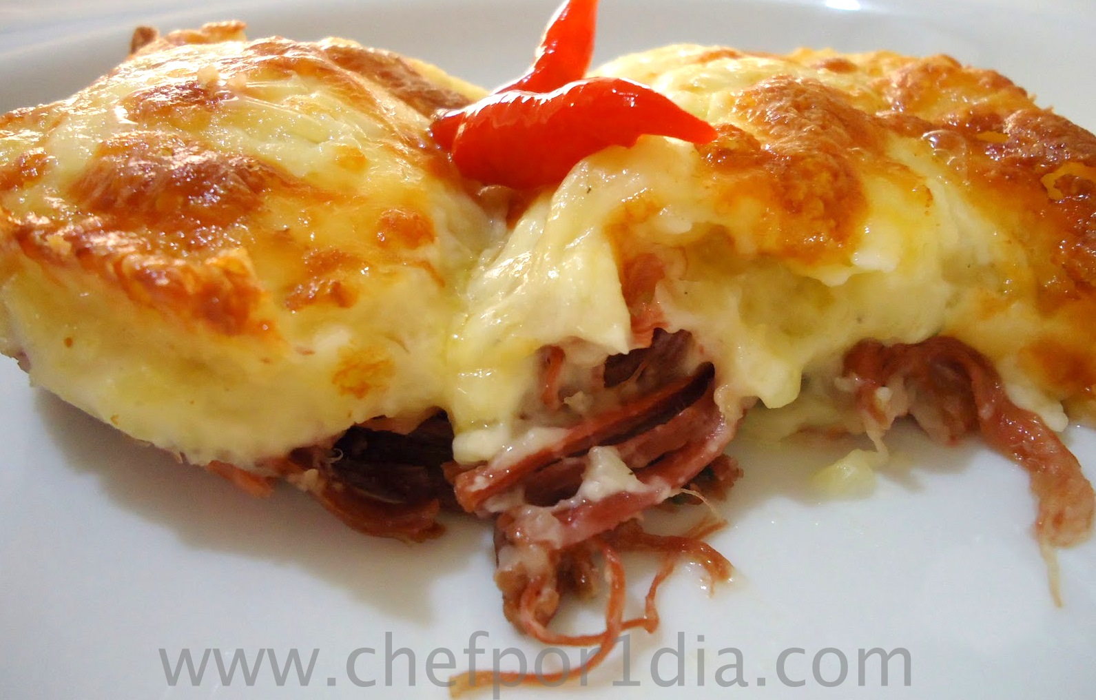 Massa: Prepare um purê, acrescente o creme de leite e as 2 colheres de manteiga, reserve