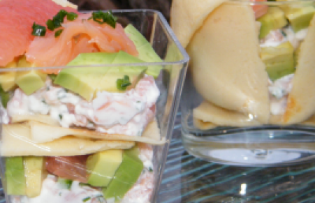 Verrines de crepes, salmão, abacate e grapefruit