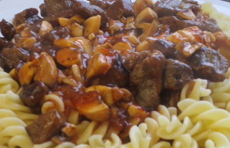 Fusilli ao molho vermelho de geleia de pêssego acompanhado por iscas de carne