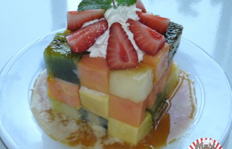 É uma Salada de Frutas com Calda de Laranja e Chantilly com Morangos em formato de um Cubo Mágico. A priori, a composição e escolhas das frutas parece ser bem simples, mas há pequenos detalhes que tornam essa receita muito saborosa e para paladares mais exigentes uma combinação tanto exótica e lúdica.