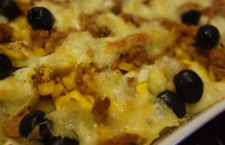 Farfalle com Ovo Cozido, Atum, Milho e Azeitonas em Gratinado de Mozarella Fresca