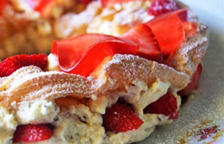 Coroa de Massa Choux Recheada com Mousse de Chocolate Branco e cobertura de Gelatina de Morango