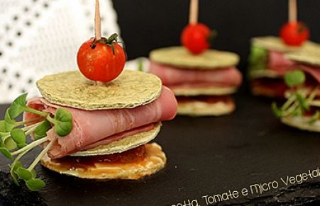 Acepipes de Pancetta, Tomate e Micro Vegetais