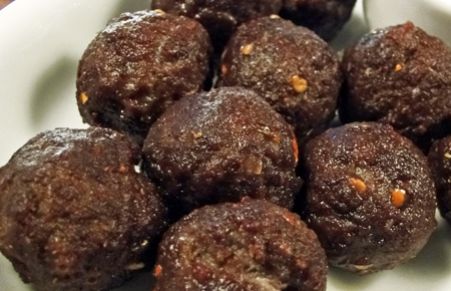 Bolinho de carne moída, de origem italiana (polpeta), também conhecida como almôndega.