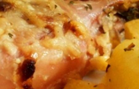 Coxa e Sobrecoxa com Creme de cebola assada com Batatas