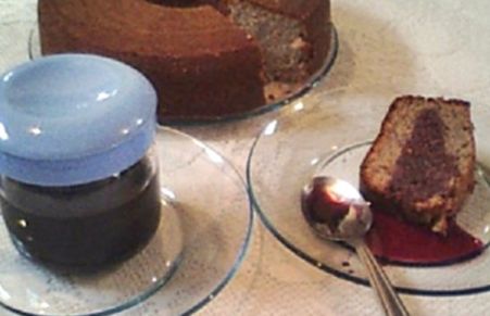 Bolo simples feito com suco de uva no lugar do leite e servido com calda de uva.
