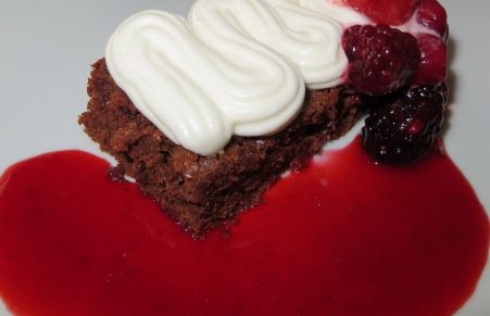 Brownie de chocolate e iogurte com chantilly e coulis de frutos silvestres