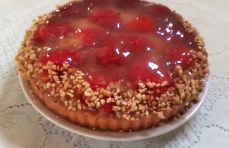 Torta de morangos com creme e geleia de brilho é um clássico.