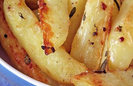 Normalmente faço essa batata com a casca, mas ela estava bem "machucadinha" e achei melhor tirar (usei aquela de casca rosa chamada asterix). Se você estiver com pressa, cozinhe as batatas em água fervente por 6 minutos. Eu fiz com ela crua, direto ao forno.
