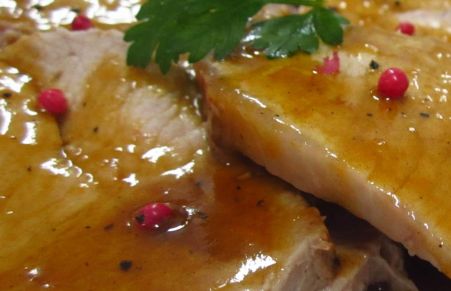 Lombo assado com aguardente, com molho de laranja, acompanhado de farofa de banana.