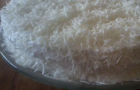Bolo branco recheado com baba-de-moça coberto com marshmallow e coco