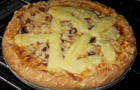 O recheio da pizza não estava incluso na receita, então eu criei um, meio que de improviso. Tudo, bem que não é preciso ser nenhum gênio para bolar recheio de pizza, mas cá entre nós, a minha combinação ficou mais que perfeita. Ainda não tive coragem de testar outras, de tão bom que ficou esta cobertura
