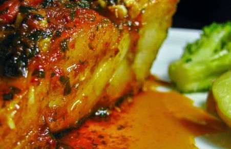 Bacalhau frito em azeite regado com um molho típico dos Açores que é feito com pimenta da terra.