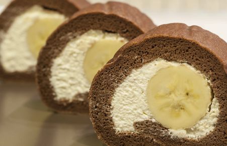 Esse rocambole é feito a partir de uma génoise de chocolate, de um creme de mascarpone e de banana.