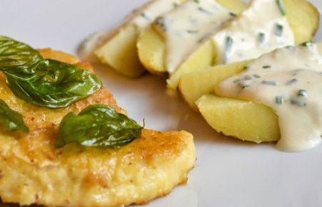 Frango empanado no parmesão com batatas assadas e molho de ciboulette