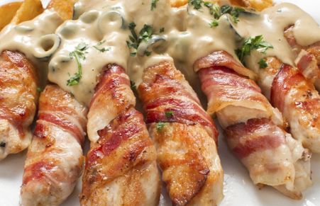 Tiras de peito de frango enroladas em bacon com delicioso molho gorgonzola! Imperdível!