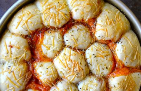 Uma ideia fantástica e deliciosa! Uma rosca de pizza, pequenos bolinhos de massa de pizza recheados com pepperoni, muçarela e molho, dispostos em uma forma e assados! Para comer rezando!