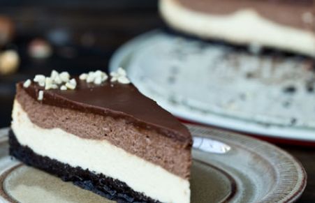 Um cheesecake com duas camadas, uma de baunilha e outra de Nutella sobre um leito de biscoito OREO e coberta com um ganache de Nutella. Precisa mais?!