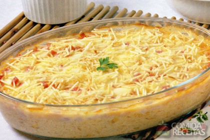 - 1 Kg de sobrecoxa ou peito de frango cozido com 1 cubo de caldo de frango e desfiado