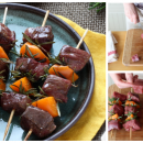 Espetinhos deliciosamente aromáticos de peito de pato, damascos e alecrim