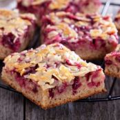 Bolo fofo de amêndoas com calda de framboesa