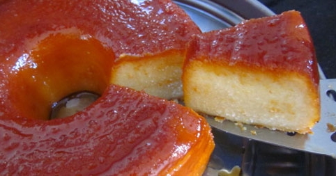 Numa forma de pudim com um furo no meio (30 cm de diâmetro), derreta ½ xícara (chá) de açúcar
