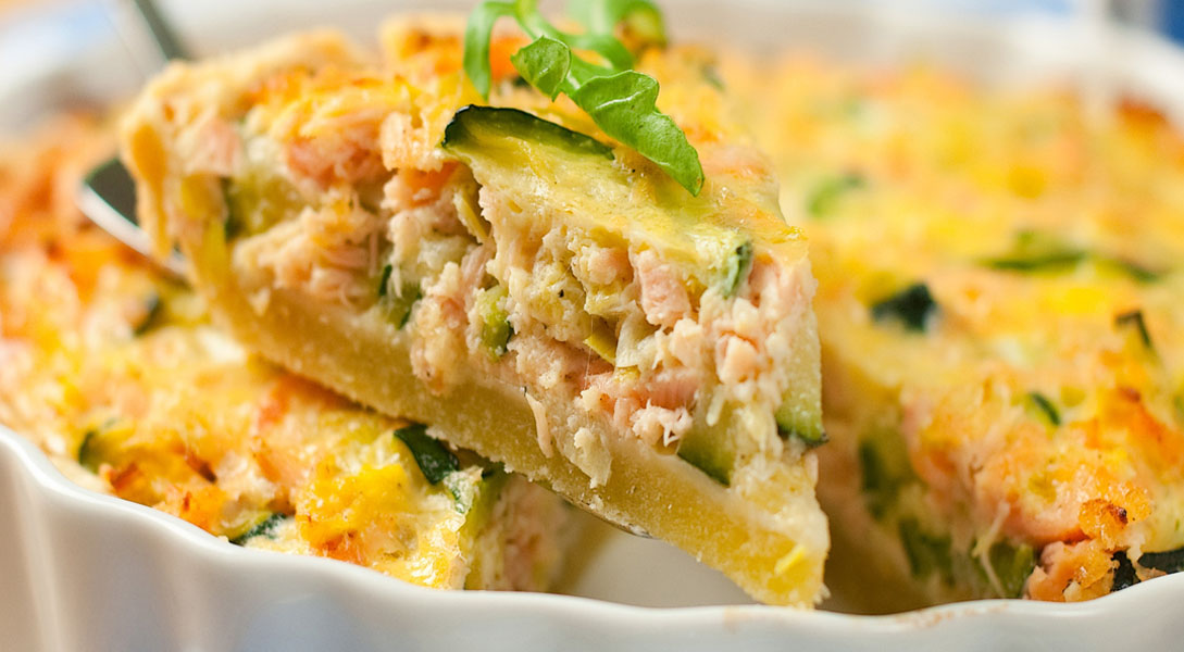 Dispor as fatias de salmão sobre a massa e despejar a mistura.