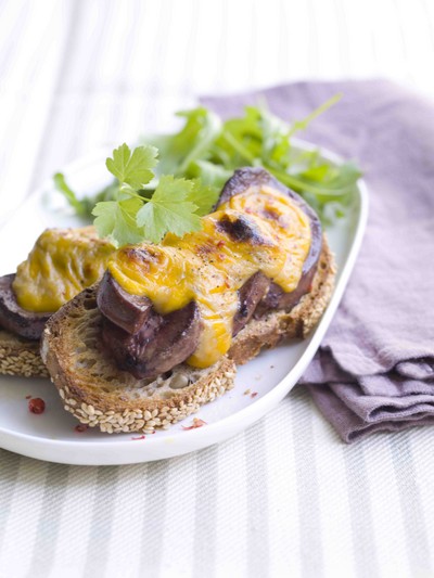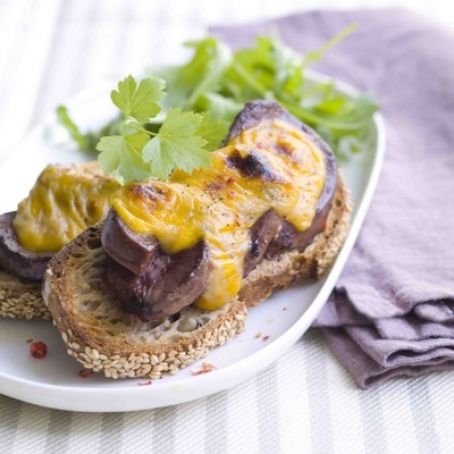 Acenda a grelha. Arrume as fatias de pão na assadeira, cubra-as com fatias de rins e cubra com o molho.