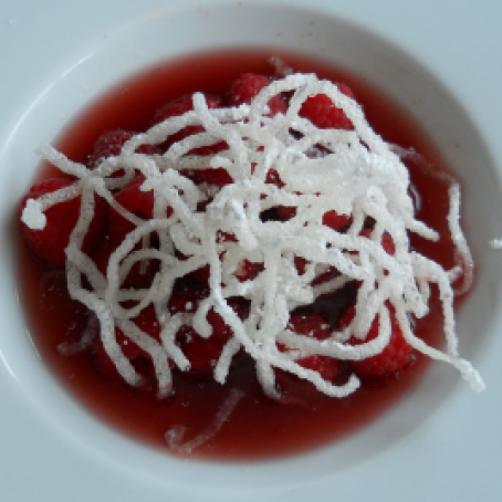Em uma tigela, uma verrine, um prato de sopa (como na foto), divida o vinho (depois de retirar a fava de baunilha) e adicione as framboesas.