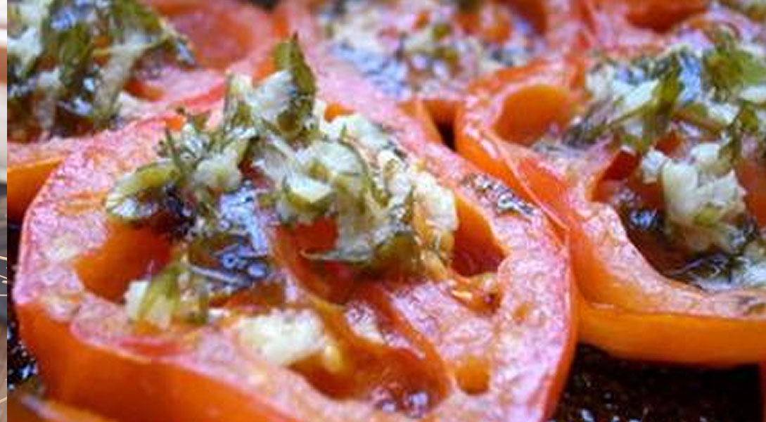 Dividir esta mistura pela quantidade de tomates e regue com mais azeite.