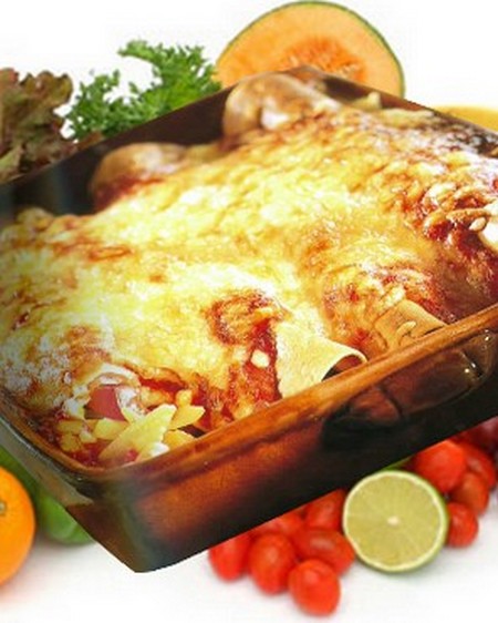 O centro de cada tortilla, coloque um quarto da guarnição. Enrole as tortillas e coloque em uma assadeira (lado aberto para baixo).