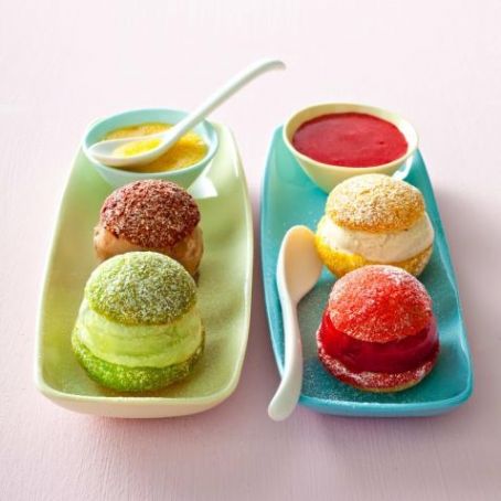 Corte as bombinhas ao meio, retirando a parte superior em formato bem redondo fazendo uma “tampinha” (vide foto). Prepare bolas de sorvete de 3cm de diâmetro e varie os sabores e cores. Conserve as bolas alguns minutos no congelador e depois coloque sobre cada bombinha, cobra com a “tampinha” e salpique açúcar de confeiteiro.