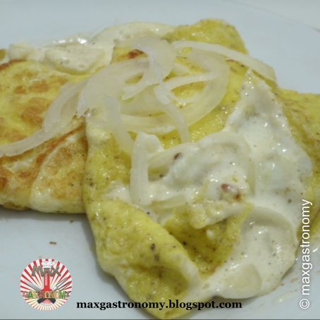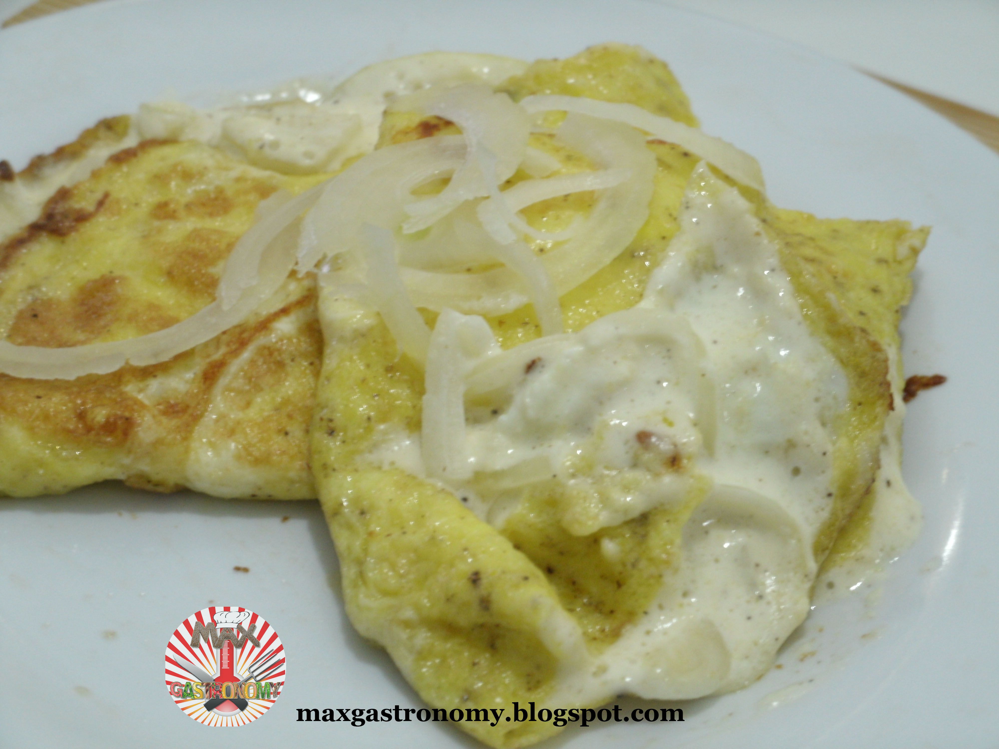 Deixar fritar até esteja quase frito mas ainda cremoso, adicionar a mistura de cebola e creme. E com uma espátula tentar fechar o omelete sem que o mesmo quebre.